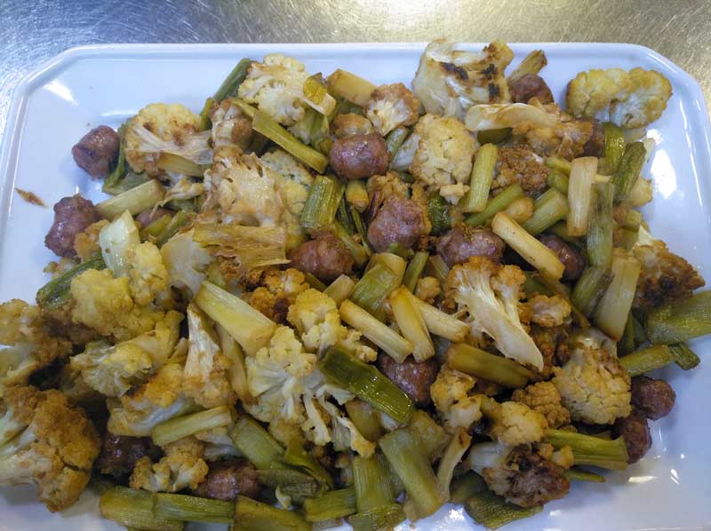 Pero, nos centramos en el almuerzo. Una buena barra con suculentas ofertas: sangre con cebolla; coliflor con ajos tiernos y longanizas; pulpito con aceite y cebollita; calamares en su tinta con ajos tiernos; bacalao frito acompañado de pimiento verde y ajoaceite; caracoles con un toque picante que enganchan; huevos fritos con pimientos de padrón y un largo etc. de propuestas para elegir en barra, además de longanizas, morcillas, panceta, secreto, etc. en brasa.